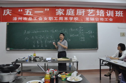 從2014年4月21日起,每逢周一晚上,公司幾十名廚藝愛好者都會興致勃勃地聚集在漳州市總工會職工業余學校,一起認認真真地學習廚藝,捧著筆記本仔細記下授課老師講解的做菜要點,睜大眼睛盯著授課老師的現場操作,從烹飪的基礎知識、刀功的基本要領、配菜的基本方法到一道道葷素搭配、家常可見的美味佳肴如芝麻雞、排糖醋肉、紅燒魚塊、椒鹽海蠣、松仁玉米、沙司茄子等,都生怕落下一個小小的細節……