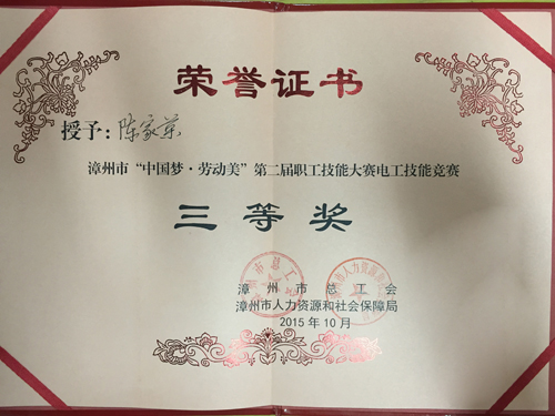 2015年10月28日,為期2天的漳州市“中國夢?勞動美” 第二屆技能大賽維修電工技能競賽圓滿落下帷幕。黃忠灼、游照輝、陳家榮、許志榕、楊文遠、李源森等6名員工代表公司參加競賽。他們在競賽中發(fā)揮出了自己的水平,其中陳家榮榮獲三等獎。