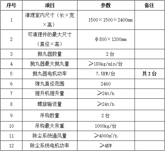 2.2功能、結(jié)構(gòu)須滿足如下要求:該設(shè)備主要由吊鉤輸送系統(tǒng)、清理室體、拋丸器、提升機、維修平臺、分離器、螺旋輸送器、底部料斗、除塵系統(tǒng)、電控系統(tǒng)等組成。