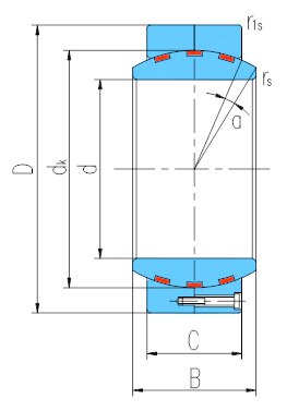 產品特點:外圈徑向分為兩半,用螺釘鎖緊,材料為碳鋼,磷化,球面鍍硬鉻;內圈材料為銅合金,球面鑲嵌固體自潤滑材料。