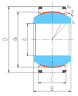 產品特點:外圈沿軸向剖分成兩半,用鎖圈固定,外圈材料為軸承鋼,淬火,球面粘貼PTFE編織物;內圈材料為軸承鋼,淬火,球面鍍硬鉻,后置代號有-2RS為外圈兩端帶有密封圈。