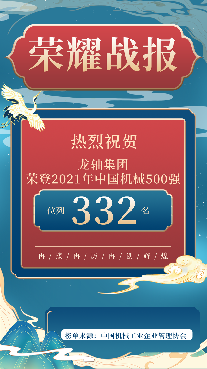 12月20日,由中國(guó)機(jī)械工業(yè)企業(yè)管理協(xié)會(huì)和機(jī)械工業(yè)信息研究院共同主辦的2021年(第十九屆)中國(guó)機(jī)械500強(qiáng)研究報(bào)告發(fā)布會(huì)在北京舉行,發(fā)布會(huì)上隆重發(fā)布了中國(guó)機(jī)械500強(qiáng)榜單,龍軸集團(tuán)創(chuàng)歷史新高,榮列332位。