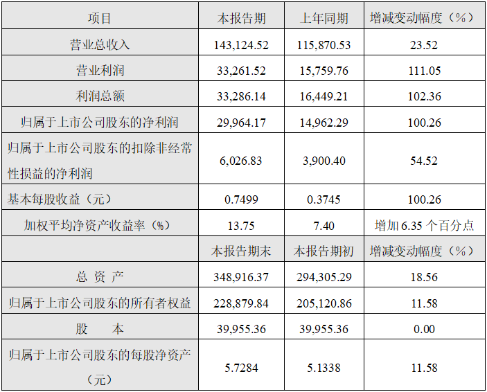 (3)報告期受益于公司主營業(yè)務(wù)增長、非經(jīng)常性損益大幅增加,公司全年利潤總額預(yù)計33,286.14萬元,同比增長102.36%;歸屬于上市公司股東的凈利潤預(yù)計29,964.17萬元,同比增長100.26%。