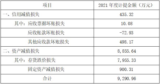 根據(jù)《企業(yè)會(huì)計(jì)準(zhǔn)則》及公司會(huì)計(jì)政策與會(huì)計(jì)估計(jì)的相關(guān)規(guī)定,為真實(shí)、準(zhǔn)確地反映公司截至 2021 年 12 月 31 日的財(cái)務(wù)狀況及經(jīng)營(yíng)成果,本著謹(jǐn)慎性原則,公司對(duì)截至 2021 年 12 月 31 日公司的資產(chǎn)進(jìn)行了減值測(cè)試,并與年審會(huì)計(jì)師進(jìn)行了充分的溝通,對(duì)可能發(fā)生資產(chǎn)減值損失的相關(guān)資產(chǎn)計(jì)提減值準(zhǔn)備。2021年確認(rèn)的資產(chǎn)減值損失及信用減值損失總額為9,290.96萬(wàn)元,相應(yīng)減少當(dāng)年利潤(rùn)總額9,290.96萬(wàn)元,具體情況如下表: