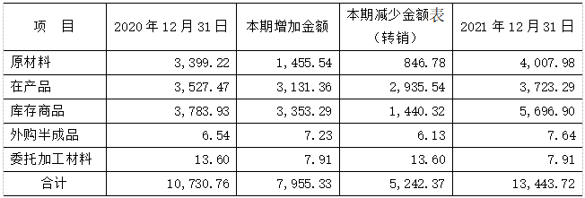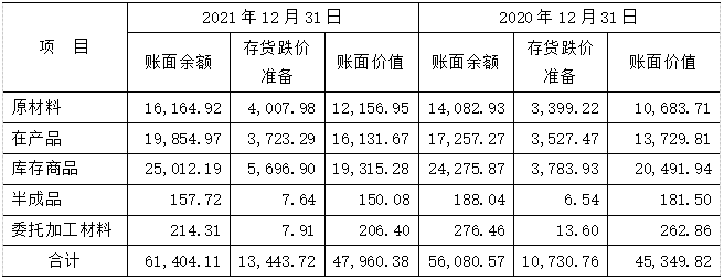 資產(chǎn)負(fù)債表日,公司對(duì)各項(xiàng)存貨的成本與可變現(xiàn)凈值比較,存貨成本高于其可變現(xiàn)凈值的,計(jì)提存貨跌價(jià)準(zhǔn)備,計(jì)入當(dāng)期損益。2021年公司存貨分類情況如下表(萬(wàn)元):
