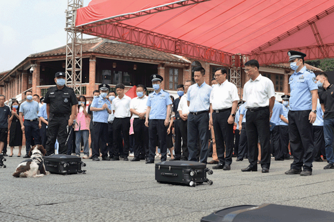 緝毒犬查緝表演區緝毒犬現場表演查緝快遞中隱藏的毒品,展示了緝毒犬精準查毒技巧,貼近實戰形式,吸引過往群眾駐足觀看。