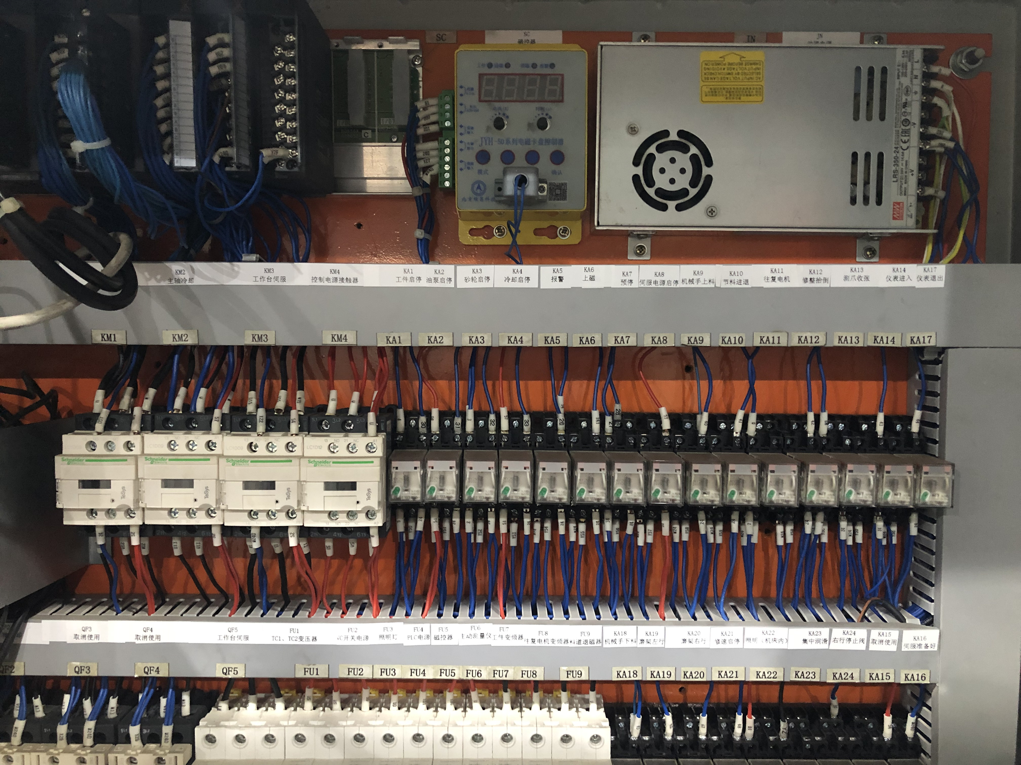 8、機(jī)床電氣柜內(nèi)電氣元件標(biāo)識(shí)要求:所有的電氣元器件、電線都必須要求有唯一的標(biāo)識(shí),標(biāo)識(shí)的內(nèi)容要求和電氣圖紙資料中的標(biāo)識(shí)相一致;電氣元件標(biāo)識(shí)位于電氣元件正上方,除了標(biāo)出與圖紙一致的元件代號(hào)外,應(yīng)標(biāo)出終端負(fù)載(或控制下一層級(jí))電氣元件的中文名稱,例如: