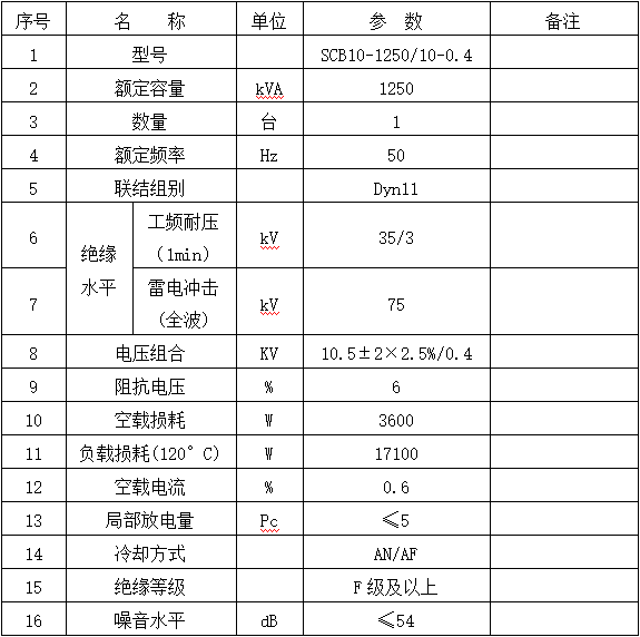 1250kVA干式變壓器的技術協議內容要求