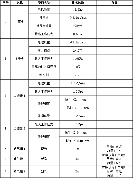 項目名稱:購置1套空壓機(jī)系統(tǒng)(約18.5kw,含配套冷干機(jī)、1m³氣罐、過濾器)