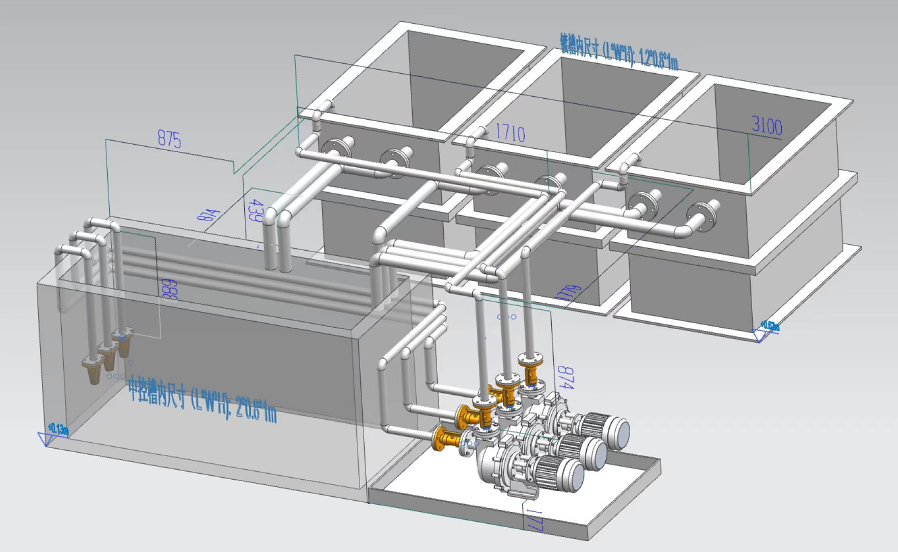 (2)每只主槽配兩路鈦制溢流管道,管與槽子焊接,槽液溢流進入中控槽液面以下100mm,并應有防虹吸措施;底閥入中控槽離槽底距離50mm;管道平面圖和立面圖附后,圖中管道尺寸按槽子相對位置作的基本設計,可在此基礎上進一步優化管道設計,實施中應根據實際測量與安裝情況作出調整材料用量。