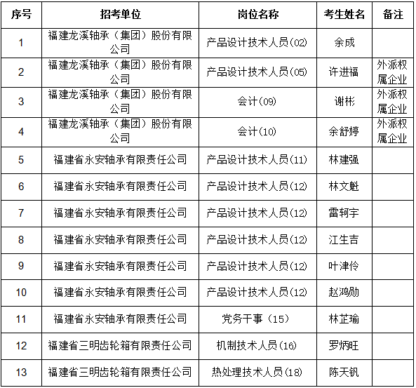 根據(jù)《福建龍溪軸承(集團(tuán))股份有限公司2023年公開招聘公告》有關(guān)規(guī)定,經(jīng)面試等程序,現(xiàn)將集團(tuán)本部及權(quán)屬企業(yè)(福建省永安軸承有限責(zé)任公司、福建省三明齒輪箱有限責(zé)任公司)擬聘用人員予以公示,公示期為5個(gè)工作日,公示名單如下: