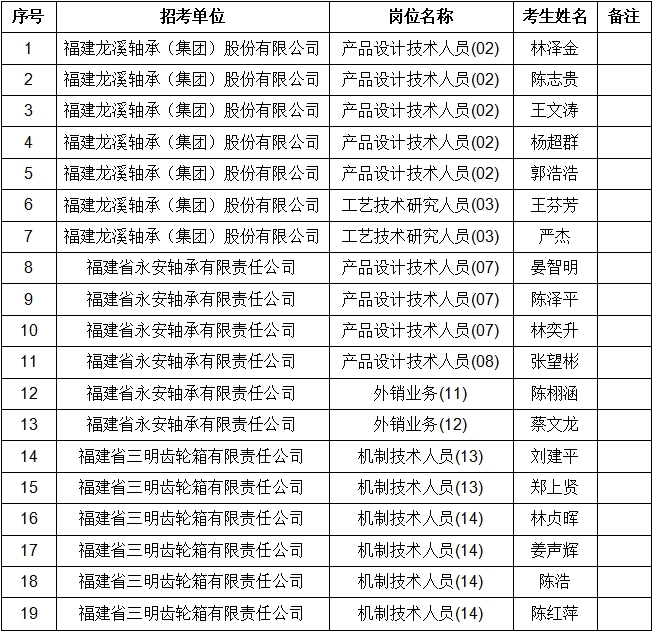 根據(jù)《福建龍溪軸承(集團(tuán))股份有限公司2023年秋季公開招聘公告》有關(guān)規(guī)定,經(jīng)面試等程序,現(xiàn)將集團(tuán)本部及權(quán)屬企業(yè)(福建省永安軸承有限責(zé)任公司、福建省三明齒輪箱有限責(zé)任公司)擬聘用人員予以公示,公示期為5個(gè)工作日,公示名單如下: