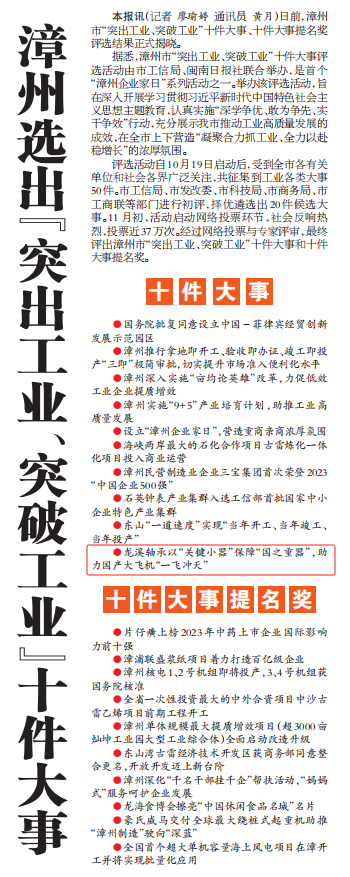 漳州市“突出工業(yè)、突破工業(yè)”十件大事評選活動經市委、市政府同意,由漳州市工信局、閩南日報社聯(lián)合主辦,是首個“漳州企業(yè)家日”系列活動之一。評選活動自10月19日啟動以來,共征集到工業(yè)各類大事50件,初評擇優(yōu)遴選出20件候選大事,經網(wǎng)絡投票與專家評審,最終評出漳州市“突出工業(yè)、突破工業(yè)”十件大事、十件大事提名獎。