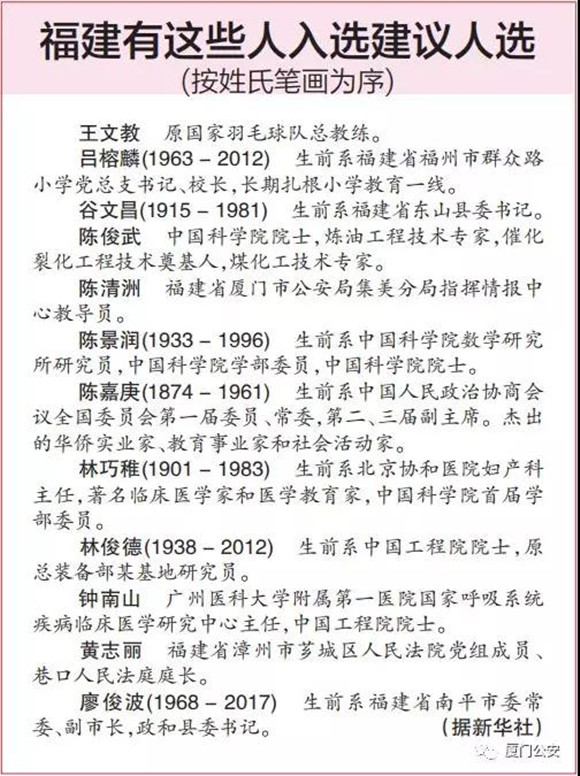 ????在前期的遴選推薦、群眾網(wǎng)上投票、組委會集中審議、中央和國家機(jī)關(guān)有關(guān)部門認(rèn)真審核下,組委會于9月15日公示了300名“最美奮斗者”建議人選名單。其中,“時代楷?!?、全國公安系統(tǒng)一級英模、廈門市公安局民警陳清洲和漳州市薌城區(qū)人民法院黨組成員、巷口人民法庭庭長黃志麗榜上有名。同時,福建共有12人入選建議人選名單。