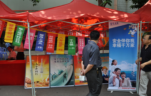 按照《漳州市人民政府安全生產(chǎn)委員會辦公室關(guān)于做好安全生產(chǎn)宣傳咨詢?nèi)栈顒?/FONT>的通知》精神,6月9日早上,我公司代表國資系統(tǒng)參加漳州市2013年安全生產(chǎn)宣傳咨詢?nèi)栈顒樱谑袇^(qū)延安北路繁華路段設(shè)置咨詢點,舉行安全生產(chǎn)知識咨詢活動。主要活動內(nèi)容有:分發(fā)安全生產(chǎn)宣傳資料;安全生產(chǎn)知識咨詢;謎語競猜;安全月主題展等。