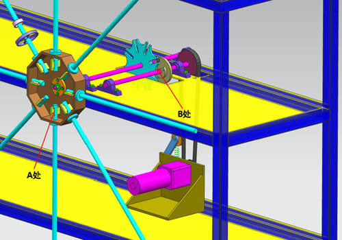 圖4為串料機構的機械傳動圖,其工作原理是:當串料桿堆滿了套圈和隔套后,電機接到感應開關的信號后啟動并開始工作,通過同步帶驅動槽輪機構實現間歇式轉動,串料盤轉過45°后電機立刻停止,此時二次循環串料開始。圖中A處所示的串料盤有八根串料桿,可實現間歇式的連續串料工作,提高設備的工作效率;B處的槽輪機構,主要實現串料桿轉盤做固定角度45°間歇式擺動,起到輪換串料的功效,便于人工卸下滿料桿和更換空料桿。