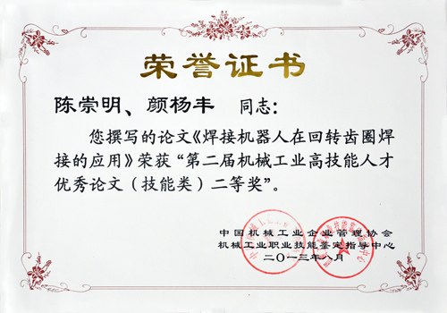 日前,由我司員工陳崇明、顏楊豐撰寫的論文《焊接機器人在回轉(zhuǎn)齒圈焊接的應(yīng)用》榮獲由中國機械工業(yè)企業(yè)管理協(xié)會、機械工業(yè)職業(yè)技能鑒定指導(dǎo)中心聯(lián)合舉辦的“第二屆機械工業(yè)高技能人才優(yōu)秀論文評選活動”技能類二等獎。
