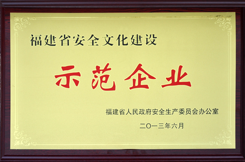 在以公司總經理許廈生擔任組長、公司黨委副書記兼安全辦主任張泰生擔任常務副組長的安全文化建設示范企業創建工作小組的領導下,通過企業自評、省級安全文化示范企業核查專家組現場審核等程序,我司最終于2013年6月獲得“福建省安全文化建設示范企業”榮譽稱號。